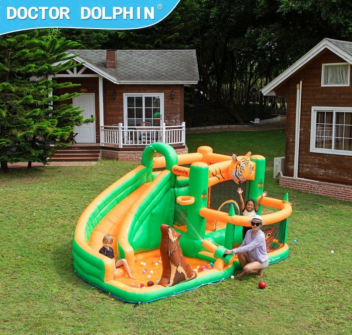 קבלו את מתנפח המים דגם “חיות” מבית Doctor Dolphin: קיר טיפוס, שכשוכית, מגלשת מים, אזור קפיצה ותותח מים — חצר אחת, אינסוף חיוכים!